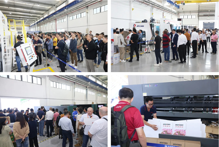 The highlight of this event was the live machine demonstrations by the subsidiaries. At 3 PM, the Dongfang Star I and APSTAR I, and Wonder WD200-60A++ Single pass high-speed printing and slotting inline systems were sequentially started up, reaching a climax of excitement. Excellent printed and accurately formed cardboard boxes quickly appeared in front of everyone. The guests gathered closely around the machines, picking up the printed and assembled boxes, continuously asking the sales staff various questions and exchanging opinions with each other.